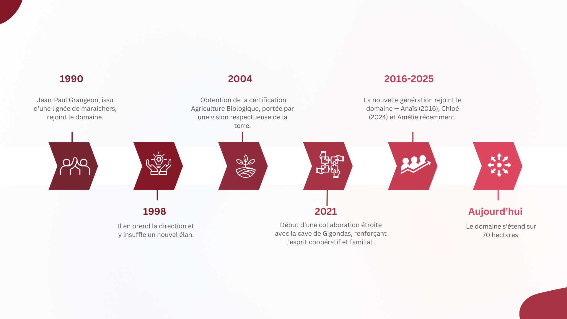Chaque génération a su préserver l’âme du domaine tout en le faisant évoluer. Nous avançons avec humilité, conscients que la vigne demande du temps, de l’attention et une main guidée par l’expérience.
