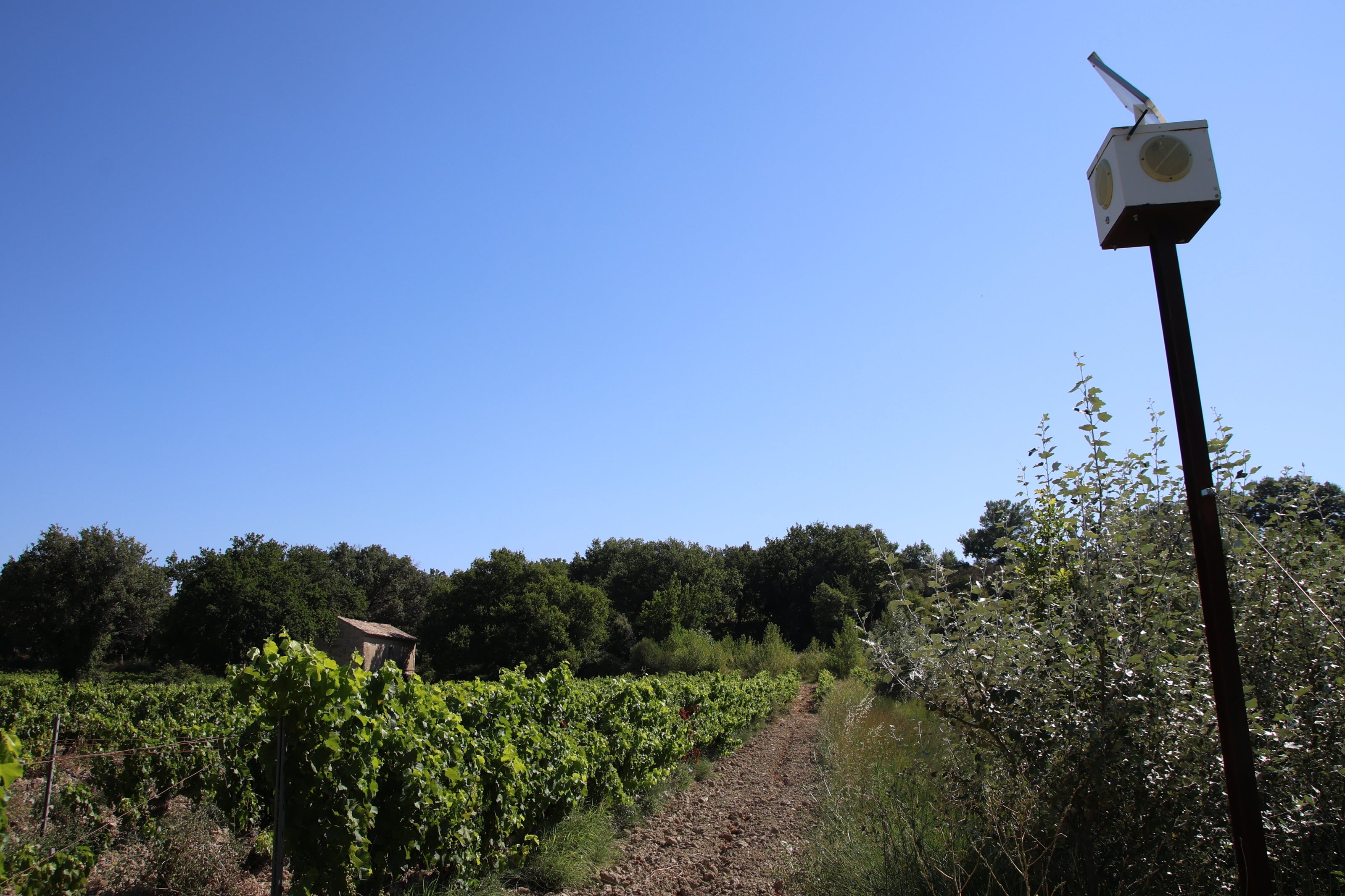 Mais les champignons ne sont pas les seuls ennemis de la vigne. Certaines maladies, comme l’esca – surnommée la « crise cardiaque » de la vigne – ne se soignent malheureusement pas. Des recherches récentes suggèrent cependant que certaines fréquences musicales pourraient ralentir leur progression. Jean-Paul a donc mis en place une parcelle test, équipée d’un haut-parleur installé sur un pilier. Une musique spécifique y est diffusée deux fois par jour avec un intervalle de 12 heures. Face aux résultats encourageants sur cette première parcelle, il a décidé, il y a trois ans, d’équiper une plus grande surface avec une box sonore, dans le but de limiter l’esca, mais aussi de lutter contre le court-noué, un virus transmis par les racines.